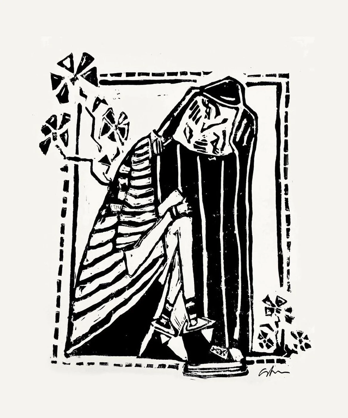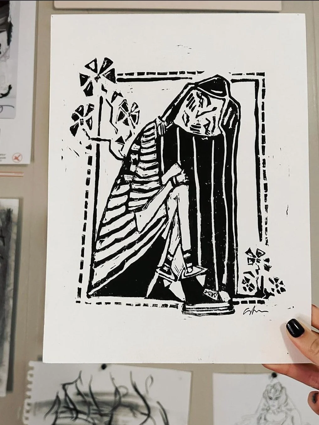 This one color linoleum block print on paper is a self portrait that explores the decay and growth of the creative process. The portrait also expresses the desire to literally “step outside of the box”.